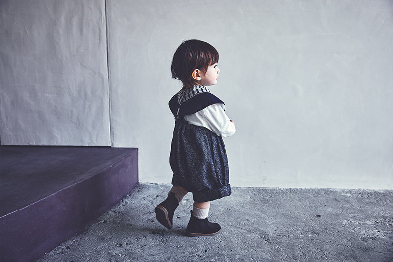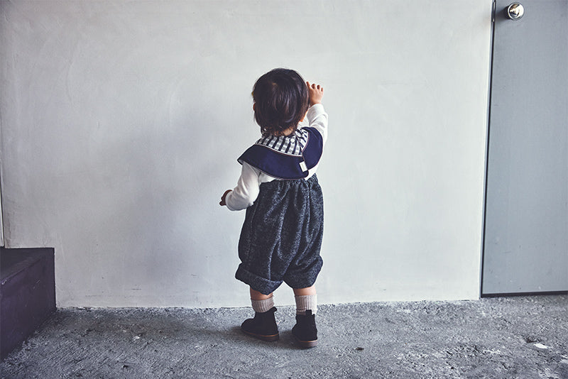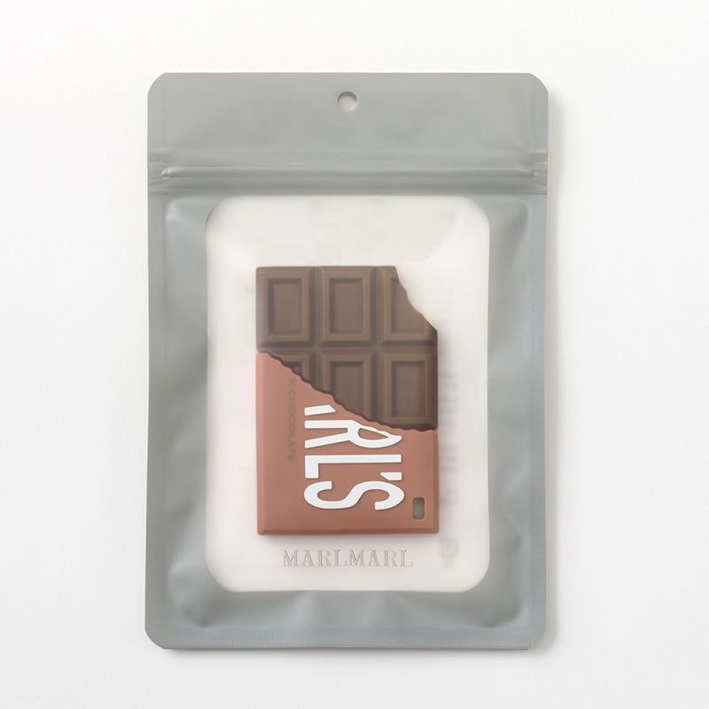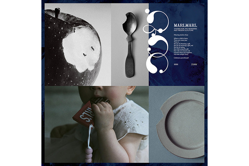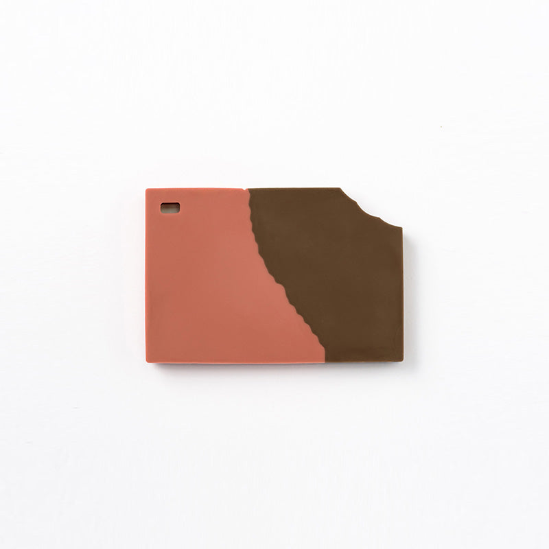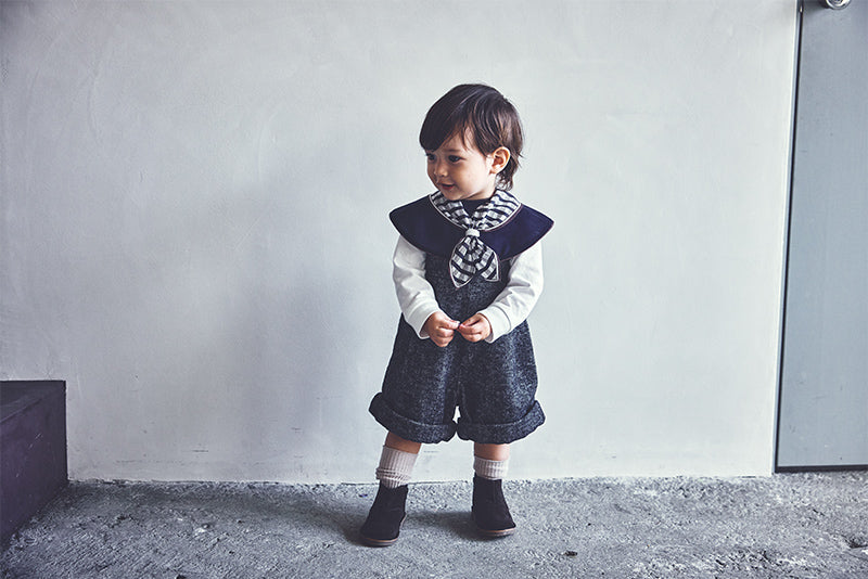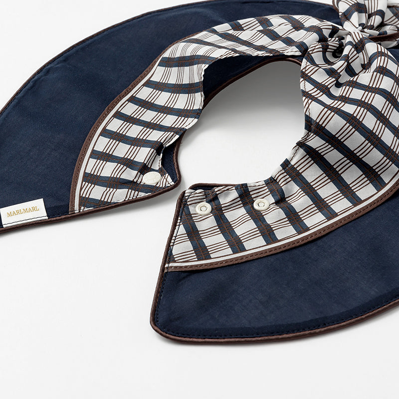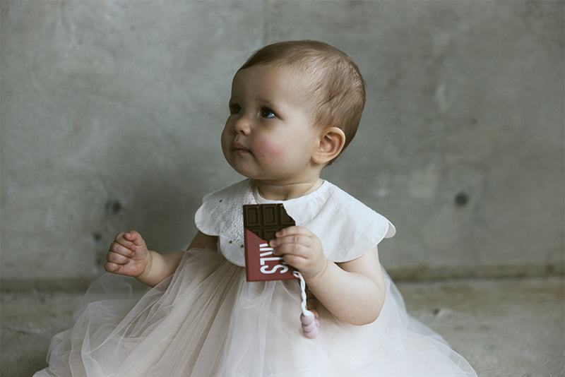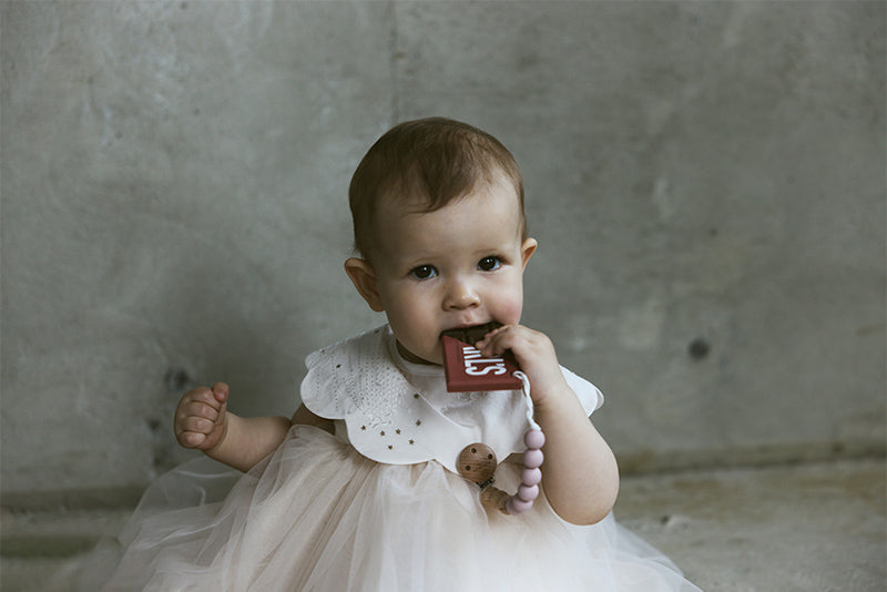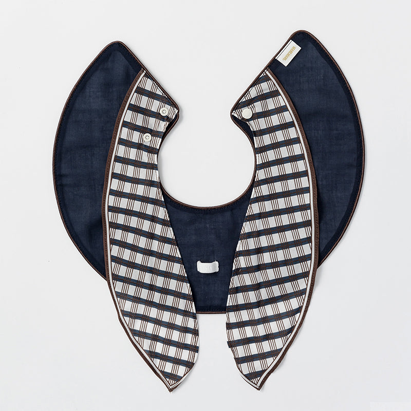 The bib is designed like a little scarf, featuring a navy and burgundy geometric pattern for a chic look. It can also be worn as a detachable collar. The teether, shaped like a piece of chocolate, comes in a deep red package for an elegant finish—playful yet polished.