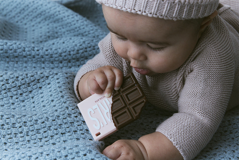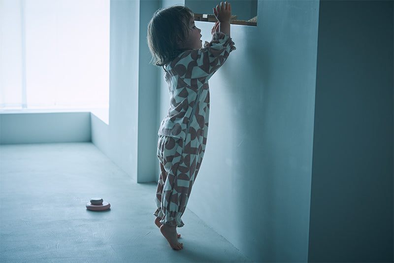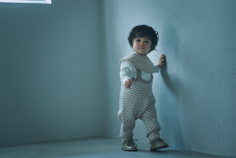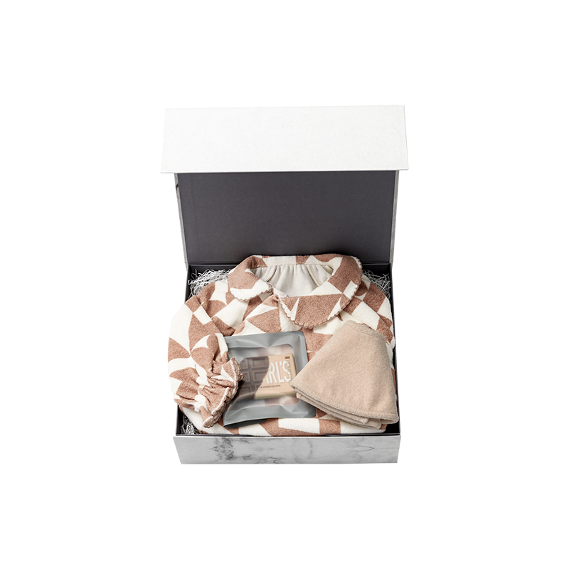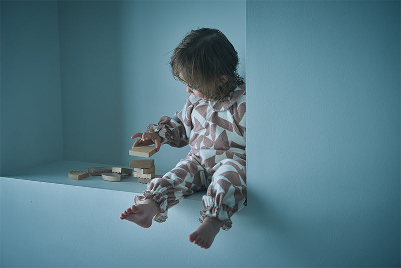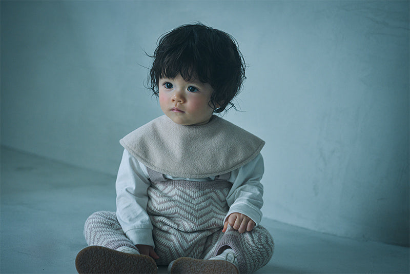 A cozy coverall for little ones who spend much of their time at home. Made from soft pile fabric with excellent stretch and absorbency, it wraps delicate skin with care. The playful block-inspired pattern adds a touch of cuteness. The simple, versatile bib is made from a special antibacterial fabric, designed in soothing tones inspired by traditional colors. A whimsical chocolate-shaped teether completes the set, supporting your baby’s growth with charm.