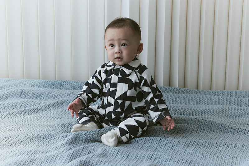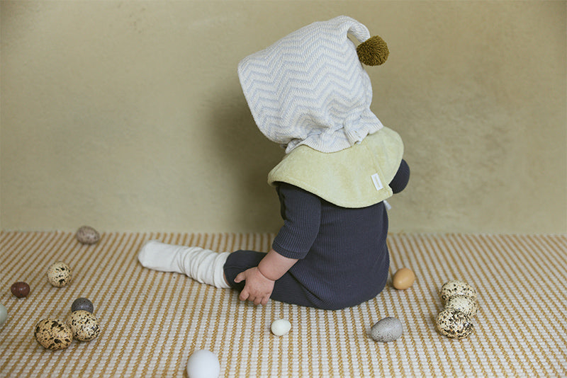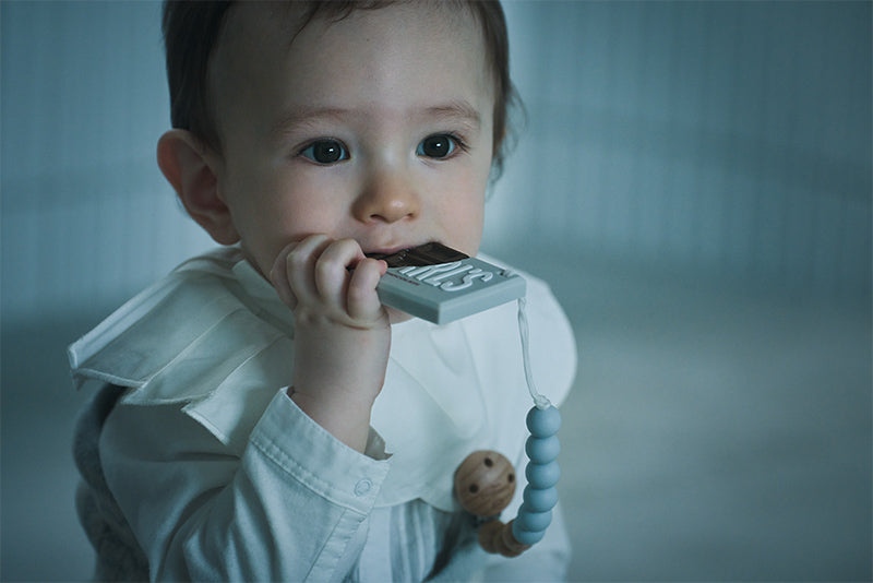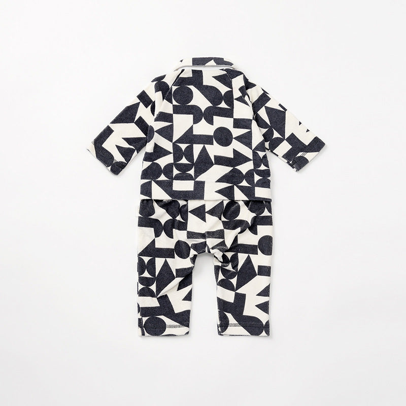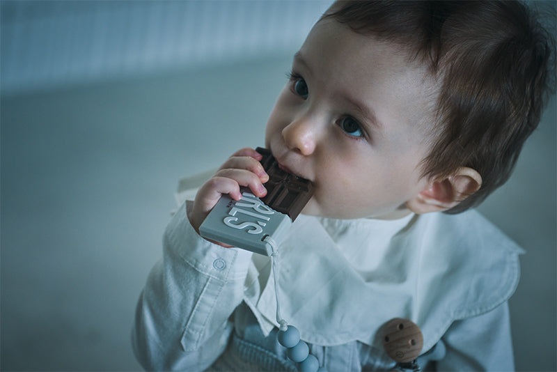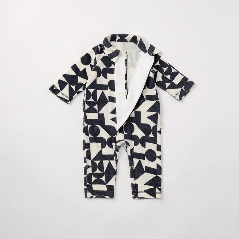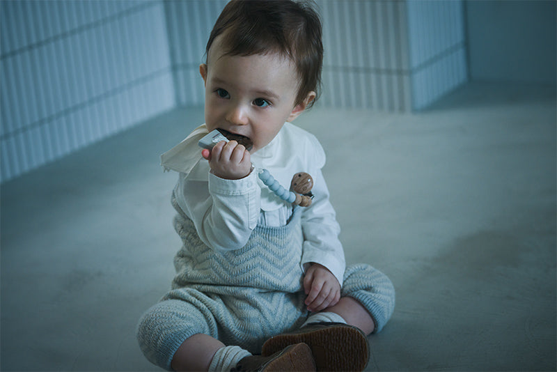 The coverall is ideal for little ones spending much of their time at home. Made from soft pile fabric with excellent stretch and absorbency, it gently wraps delicate skin. Its navy block-inspired pattern adds a playful touch. The bib, in a rich yellow hue, is simple yet crafted with high-quality antibacterial fabric to keep both baby and parents comfortable. The chocolate-shaped teether, made from BPA-free silicone and natural wood, is safe, easy to clean, and full of charm.