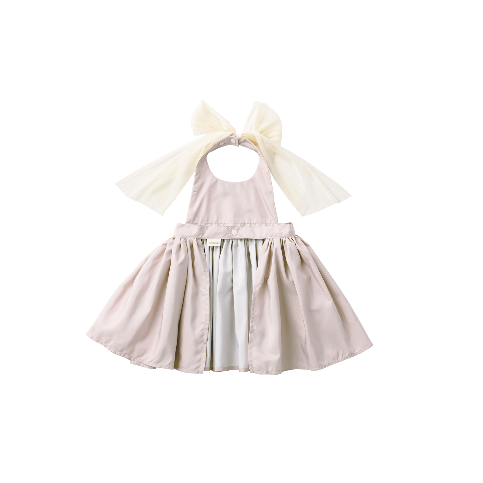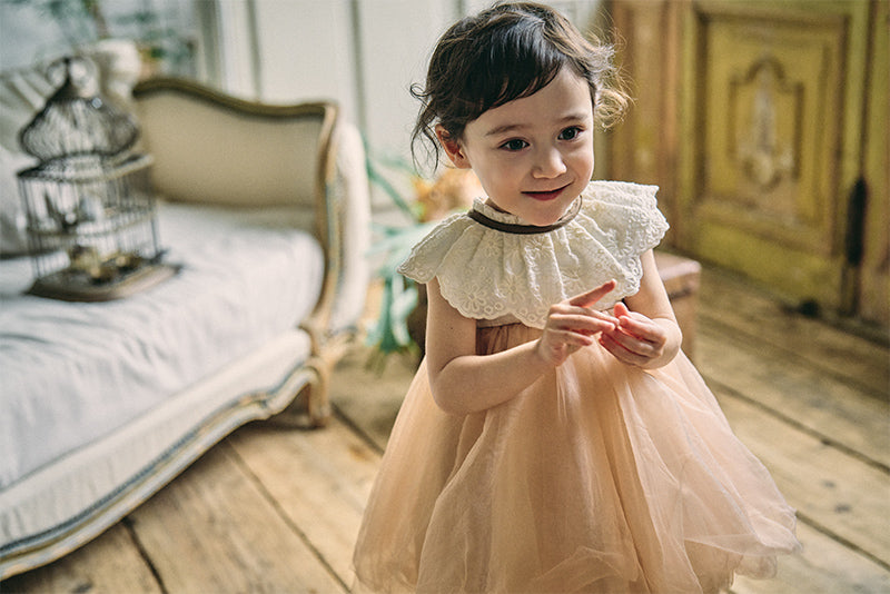 An elegant coordination set designed for birthdays, weddings, or special gatherings. The dress-like apron is easy to care for and protects clothing from stains, while pairing it with the lace bib creates an irresistibly cute look in an instant.